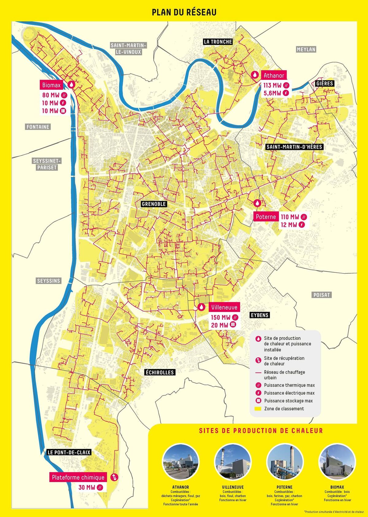 Le réseau de Chauffage Urbain dessert 7 communes de la Métropole grenobloise. Découvrez ici le réseau et la zone de classement, ainsi que l'implantation des sites de production.